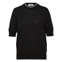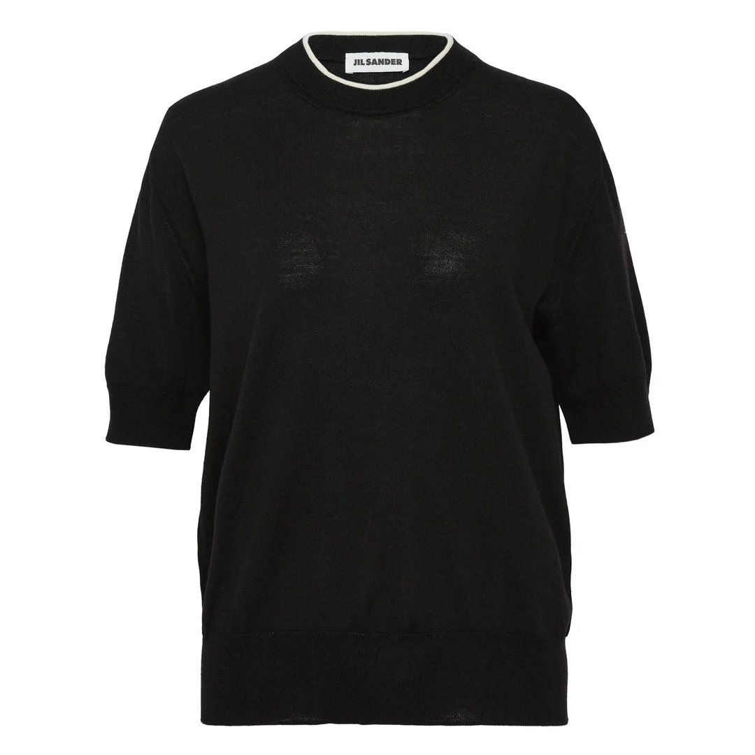 600077954BLK034 / J02GC0146/J14832/001 - Superfine merino wool construction - Contrast cream trim at neckline - Short sleeves - Crew neckline - Relaxed fit - Ribbed hemline Jil Sander Short Sleeve Jumper delivers minimalist luxury with premium superfine merino wool construction. Crafted from ultra-soft merino in sophisticated black, featuring contrast cream trim detailing at the neckline for subtle brand refinement. The relaxed silhouette and signature clean aesthetic create a versatile wardrobe essential for contemporary styling.