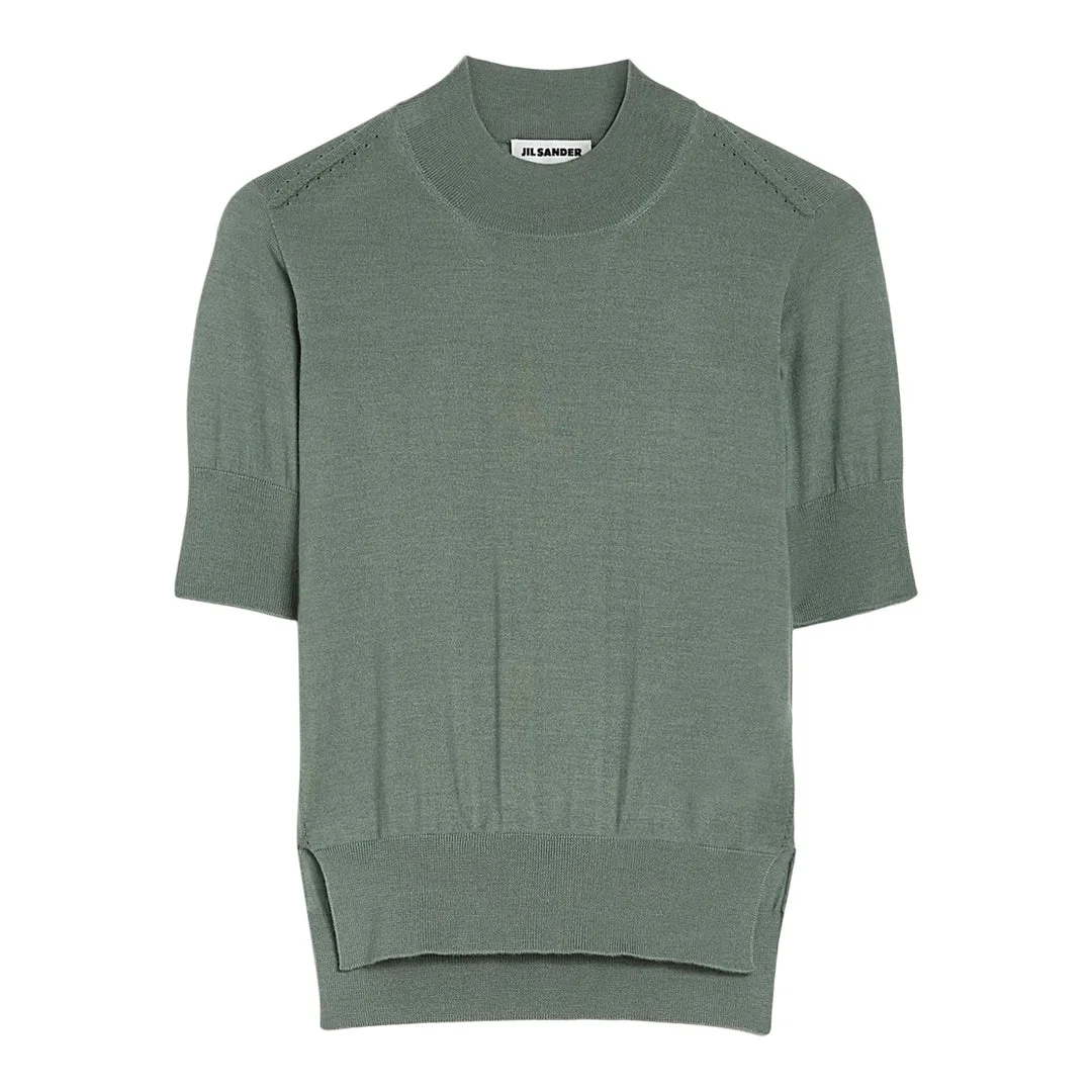 600073145GRN032 / PF25-J01GP0004/J14501/334-CRU - 100% superfine cashmere construction - Short sleeves with ribbed cuffs - Perforated detailing at shoulders - High crew neckline - Stepped hem design - Relaxed fit The Jil Sander Superfine Cashmere Sweater delivers minimalist luxury with exceptional softness and refined construction. Crafted from premium superfine cashmere in sophisticated sage green, featuring subtle perforated detailing along the shoulders and signature clean aesthetic. The relaxed silhouette and premium hand-feel elevate any wardrobe with timeless sophistication.