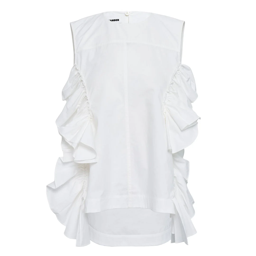 600077970WHT034 / J02NC0292/J45319/100 - Sleeveless design with high neckline - Dramatic ruched side panels - Cascading fabric draping - Lightweight cotton construction - Button closure at back neck - Relaxed fit through body - Asymmetrical hemline The Jil Sander Tobi Light Cotton Top delivers minimalist elegance with architectural draping and modern sophistication. Crafted from lightweight cotton in pure white, featuring dramatic ruched detailing and cascading fabric elements that create dynamic movement. The sleeveless silhouette and signature clean aesthetic showcase the brand's commitment to innovative construction and timeless design.