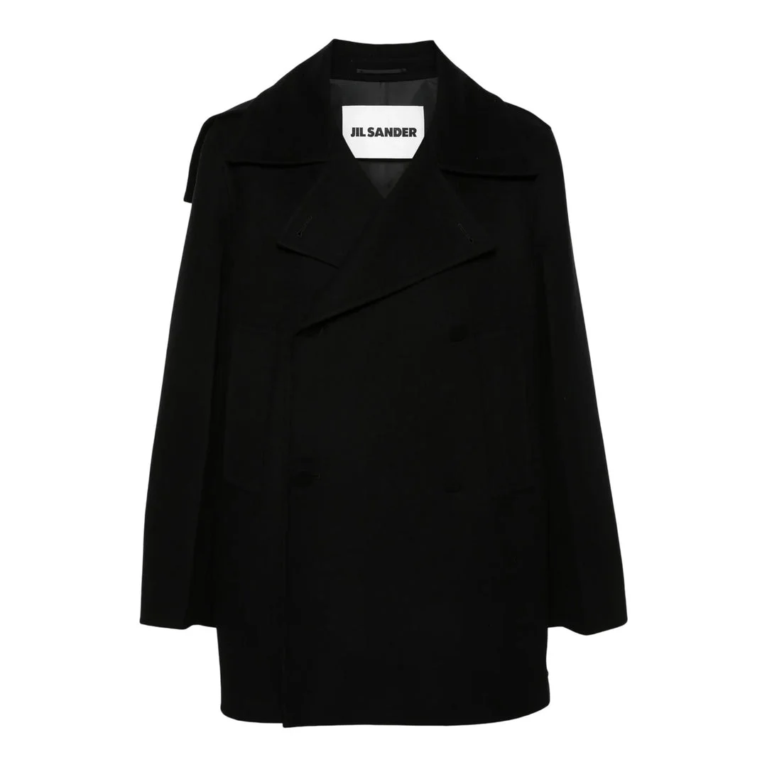600053850BLK048 / J22AM0109/J40153/001-PRE - Premium wool-cashmere blend construction - Double-breasted front closure - Wide peak lapels - Long sleeves with turned-up cuffs - Relaxed oversized fit - Mid-length silhouette - Minimalist design aesthetic Jil Sander Wool Cashmere Blend Coat delivers minimalist luxury with sophisticated tailoring and exceptional warmth. Crafted from premium wool-cashmere blend in classic black, featuring a structured double-breasted silhouette with the brand's signature clean lines. The oversized lapels and relaxed fit create a timeless statement piece that embodies understated elegance.