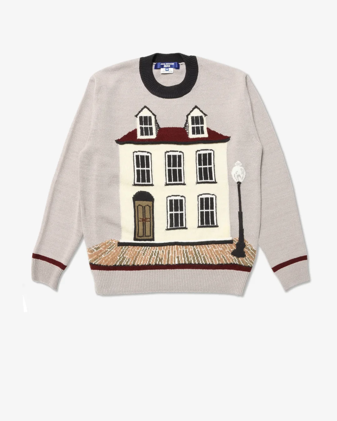 600080156PUR00M / WQ-N013/051/1/1A - Intarsia jacquard knit construction - Architectural house motif design - Contrast black ribbed neckline and cuffs - Long sleeves with fitted cuffs - Premium wool blend composition - Regular fit silhouette - Detailed window and door elements The Junya Watanabe Intarsia Jacquard House Sweater delivers avant-garde storytelling through intricate architectural knit work. Crafted from premium wool blend with detailed intarsia technique, featuring a whimsical house motif with windows, door, and street lamp elements. The structured jacquard construction and contrast ribbing showcase the designer's signature narrative-driven aesthetic.