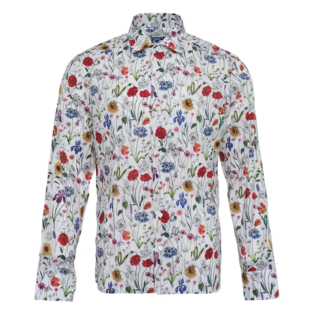 600080130WHT00L / WQ-B013/051/1/1A - All-over botanical wildflower print - Classic point collar - Long sleeves with button cuffs - Front button placket - Lightweight cotton poplin construction - Tailored fit Maria Santangelo Floral Shirt delivers botanical elegance with contemporary Italian craftsmanship and vibrant wildflower motifs. Crafted from lightweight cotton poplin with an all-over multicolored botanical print featuring poppies, daisies, and cornflowers on a crisp white base. The classic collar construction and tailored fit create a refined statement piece perfect for sophisticated casual styling.