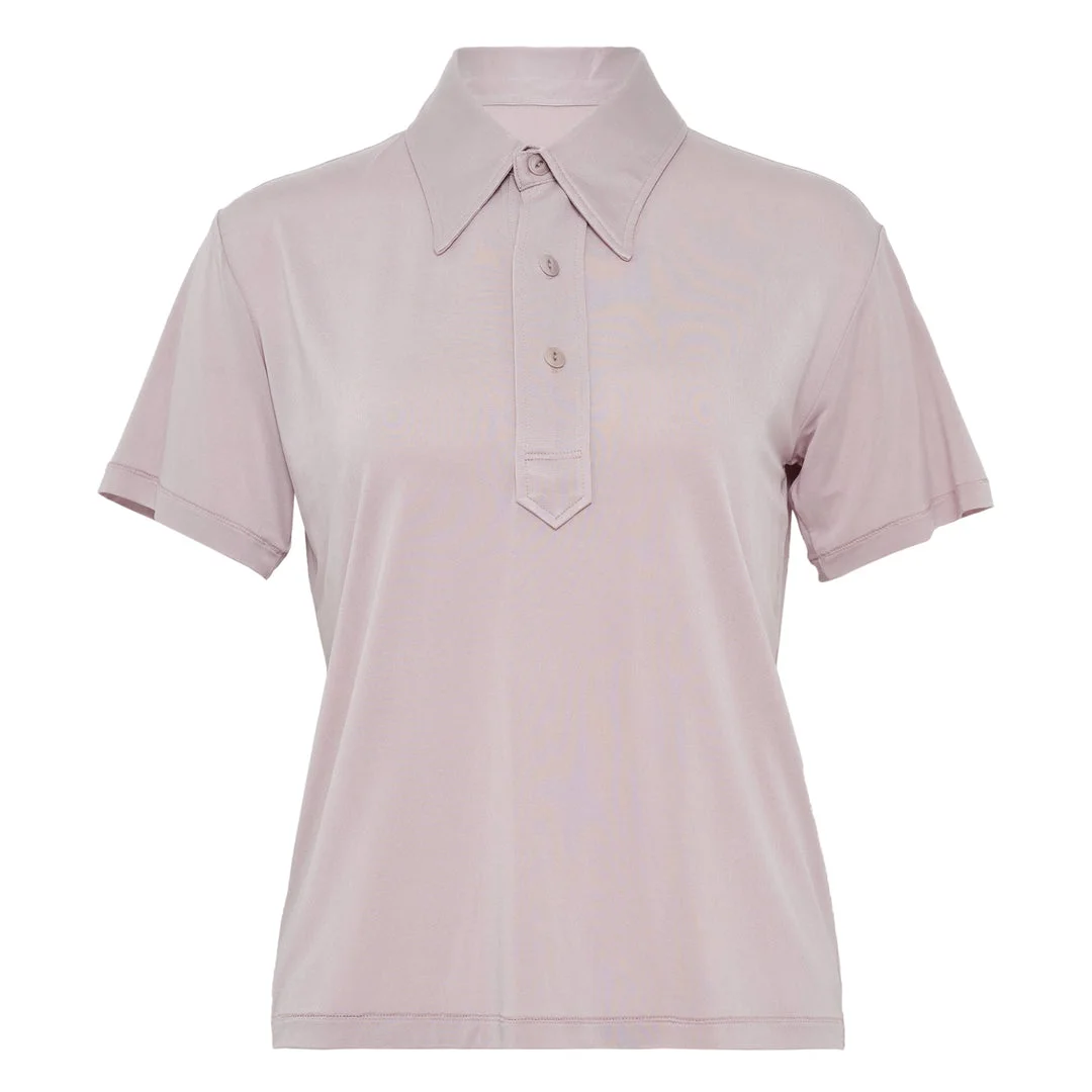 600077750BGE00L / S51GL0066/M20171/361 - Classic point collar - Three-button placket - Short sleeves - Chest pocket detail - Cupro jersey construction - Regular fit - Soft drape and smooth texture The Maison Margiela Cupro Jersey Polo Shirt delivers refined minimalism with luxurious comfort. Crafted from premium cupro jersey in sophisticated dusty pink, featuring the brand's signature clean construction and superior drape. The classic collar design and soft texture create an elevated essential for contemporary wardrobes.