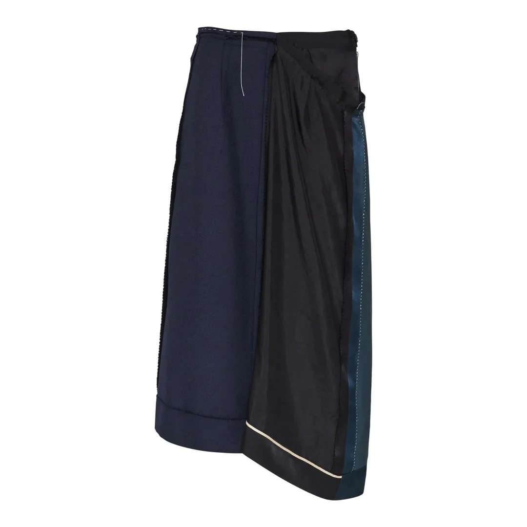 600072900BLU038 / S51ME0039/MTN099/524 - Color-blocked navy and black panels - Exposed contrast stitching detail - Asymmetrical panel construction - Raw-edge finishing - Mid-calf length - High-waisted fit - Premium wool blend fabrication Maison Margiela Midi Skirt delivers deconstructed elegance with the brand's signature avant-garde aesthetic. Crafted from premium wool blend in sophisticated navy and black color-blocking, featuring exposed contrast stitching and asymmetrical panel construction. The architectural silhouette and signature raw-edge detailing create a modern statement piece that embodies the house's conceptual design philosophy.