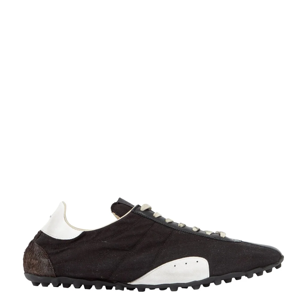 600066611BLK042 / S57WS0509/P8190/HA778 - Textured hairy drill upper construction - Contrasting white leather heel tab and toe detail - Traditional lace-up closure - Signature Maison Margiela sole design - Low-top athletic silhouette - Padded collar and tongue - Rubber outsole with textured grip Maison Margiela Sprinters Low Top Drill Hairy delivers avant-garde luxury with deconstructed athletic aesthetics and artisanal craftsmanship. Crafted from textured hairy drill fabric in charcoal with contrasting white leather details, featuring the signature Tabi-inspired silhouette. The innovative sole construction and premium materials create a distinctive statement piece that blends high fashion with sportswear functionality.