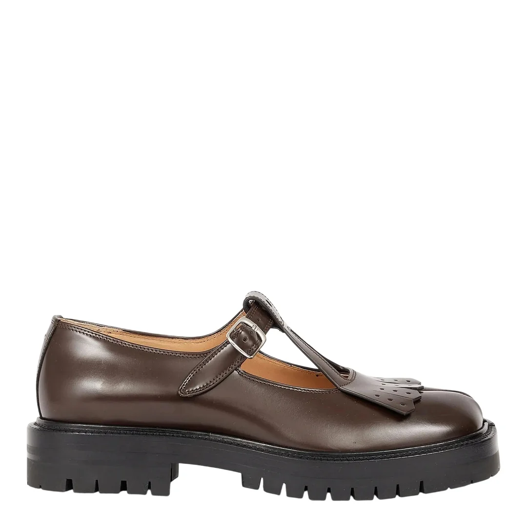 600072902DBR036 / S58WR0115/P3827/T2348 - Signature Tabi split-toe construction - T-bar design with adjustable buckle closure - Premium leather upper with perforated detailing - Chunky platform sole with lugged tread - Leather lining and insole - Low block heel The Maison Margiela Tabi County Mary-Jane delivers the house's iconic split-toe silhouette with refined Mary-Jane sophistication. Crafted from premium brown leather with traditional T-bar construction and adjustable buckle closure, featuring the signature divided toe design. The chunky platform sole and artisanal craftsmanship create a bold statement piece that bridges avant-garde design with timeless femininity.