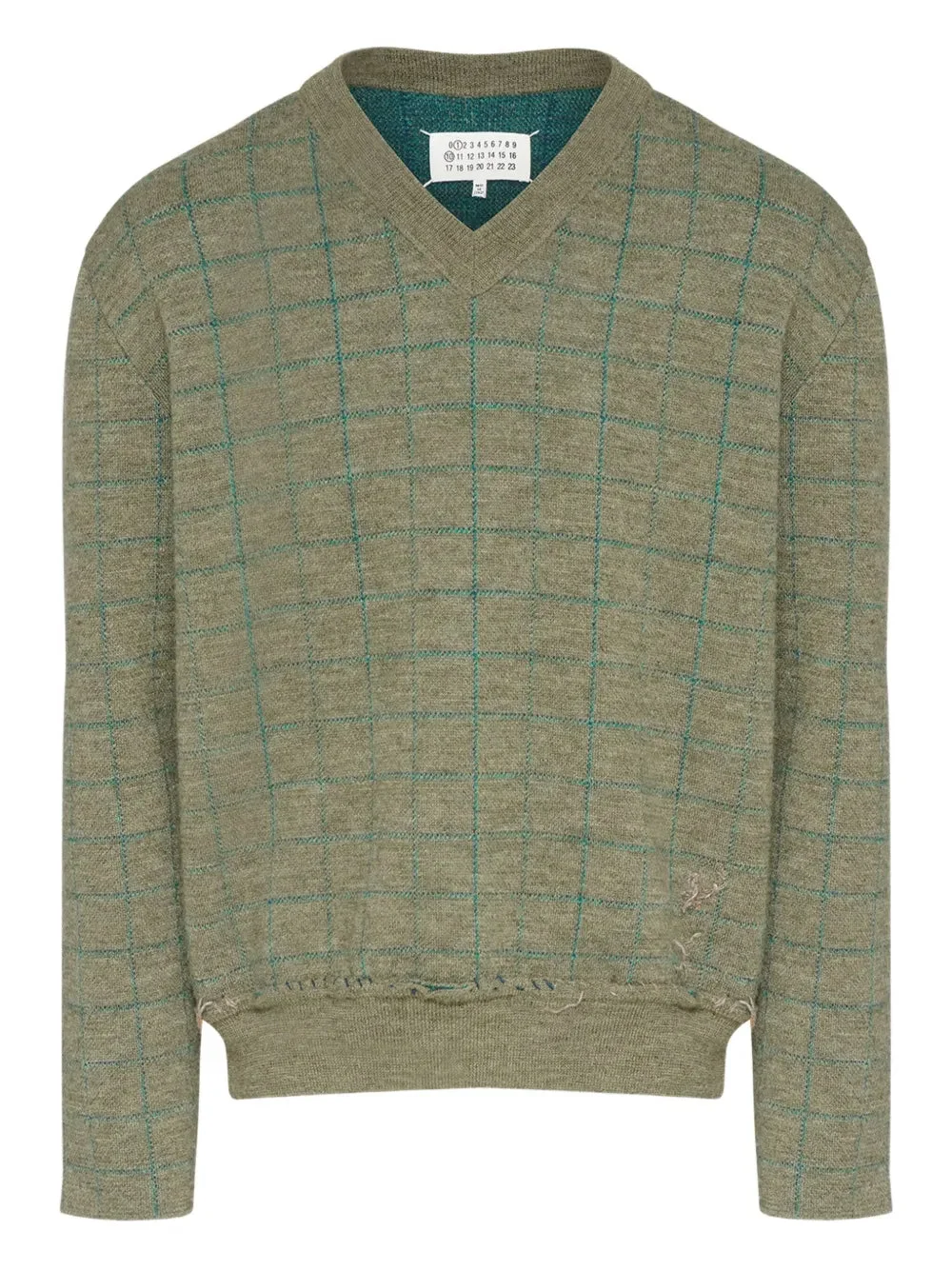 600071915OLV00L / S50HN0016/M13146/613J - V-neckline with ribbed collar trim - Long sleeves with ribbed cuffs - Windowpane check pattern throughout - Raw edge distressed detailing - Ribbed hem with worn finish - Oversized relaxed fit - Signature Maison Margiela label Maison Margiela V-Neck Top delivers avant-garde minimalism with deconstructed luxury craftsmanship. Crafted from premium knit in sophisticated olive green with teal windowpane check pattern, featuring raw edge detailing and signature distressed elements. The relaxed oversized silhouette and numbered label system embody the house's conceptual approach to modern wardrobe essentials.