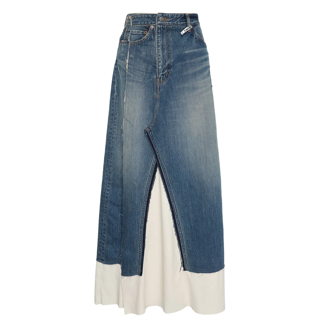 600080185IND036 / K16SK314/00/INDIGO - Front button and zip closure - Classic five-pocket denim construction - Contrasting white fabric panel inserts - Front slit opening - High-waist fit - Raw edge detailing - Maxi length silhouette MIHARA YASUHIRO Denim Combined Skirt delivers innovative silhouettes through deconstructed design and unexpected material combinations. Crafted from premium denim with contrasting white fabric panel inserts, featuring the brand's signature avant-garde construction techniques. The unique hybrid design merges traditional denim elements with flowing fabric panels for contemporary statement dressing.