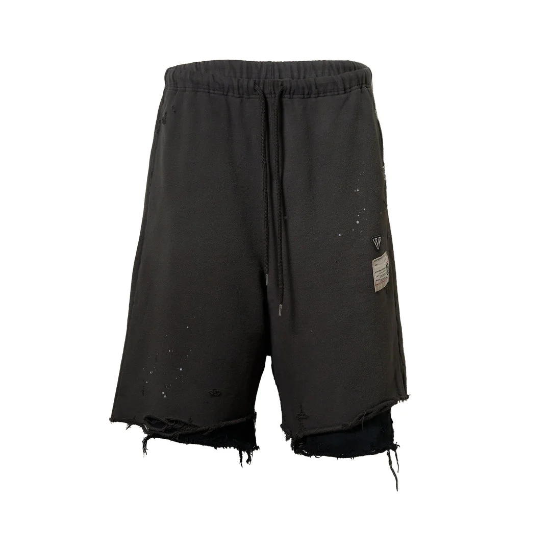 MIHARA YASUHIRO Layered Shorts deliver avant-garde Japanese streetwear with deconstructed design and architectural layering. Crafted from premium cotton in charcoal black with distressed detailing, paint splatter accents, and raw-edge hem construction throughout. The signature layered silhouette and artisanal finishing create a bold statement piece for contemporary wardrobes.