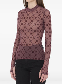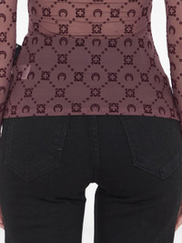 600075711PUR00M / AW25-WTO388A/CJER0005/PU70 - Mock turtleneck collar - Long sleeves with fitted cuffs - All-over flocked moonogram print - Semi-sheer mesh construction - Slim fit silhouette - Signature crescent moon motifs Marine Serre Moonogram Mesh Flock High Neck Tee delivers futuristic streetwear with signature crescent moon motifs and sheer mesh construction. Crafted from semi-sheer mesh fabric in dusty rose with flocked moonogram print throughout, featuring a fitted silhouette and mock turtleneck design. The all-over signature crescent moon pattern creates Marine Serre's iconic upcycled aesthetic for contemporary wardrobes.