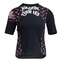 600075736BLK00M / WTT001B/UJER0003/BK85 - Regenerated jersey fabric construction - Baby fit silhouette - Crew neckline - Short sleeves - Allover graphic print with crescent moons - Sustainable upcycled materials Marine Serre Regenerated Graphic Jersey Baby Fit T-Shirt delivers sustainable streetwear with the brand's signature upcycled aesthetic. Crafted from regenerated jersey fabric in black, featuring bold graphic prints including pink crescent moon motifs and vintage-inspired artwork. The fitted baby silhouette and sustainable construction showcase Marine Serre's commitment to circular fashion and innovative design.