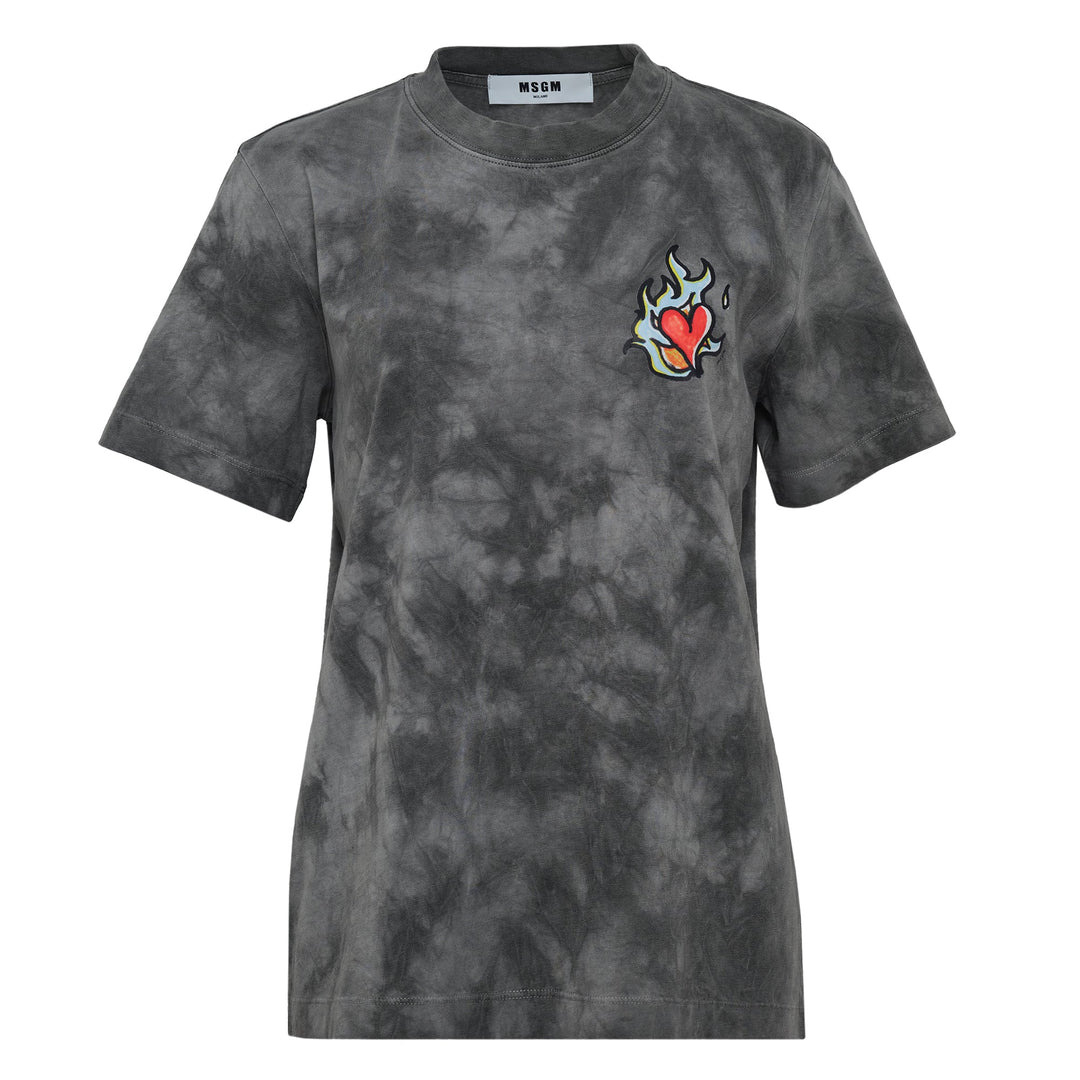 Grey tie-dye jersey T-shirt with MSGM "Heart on fire" print