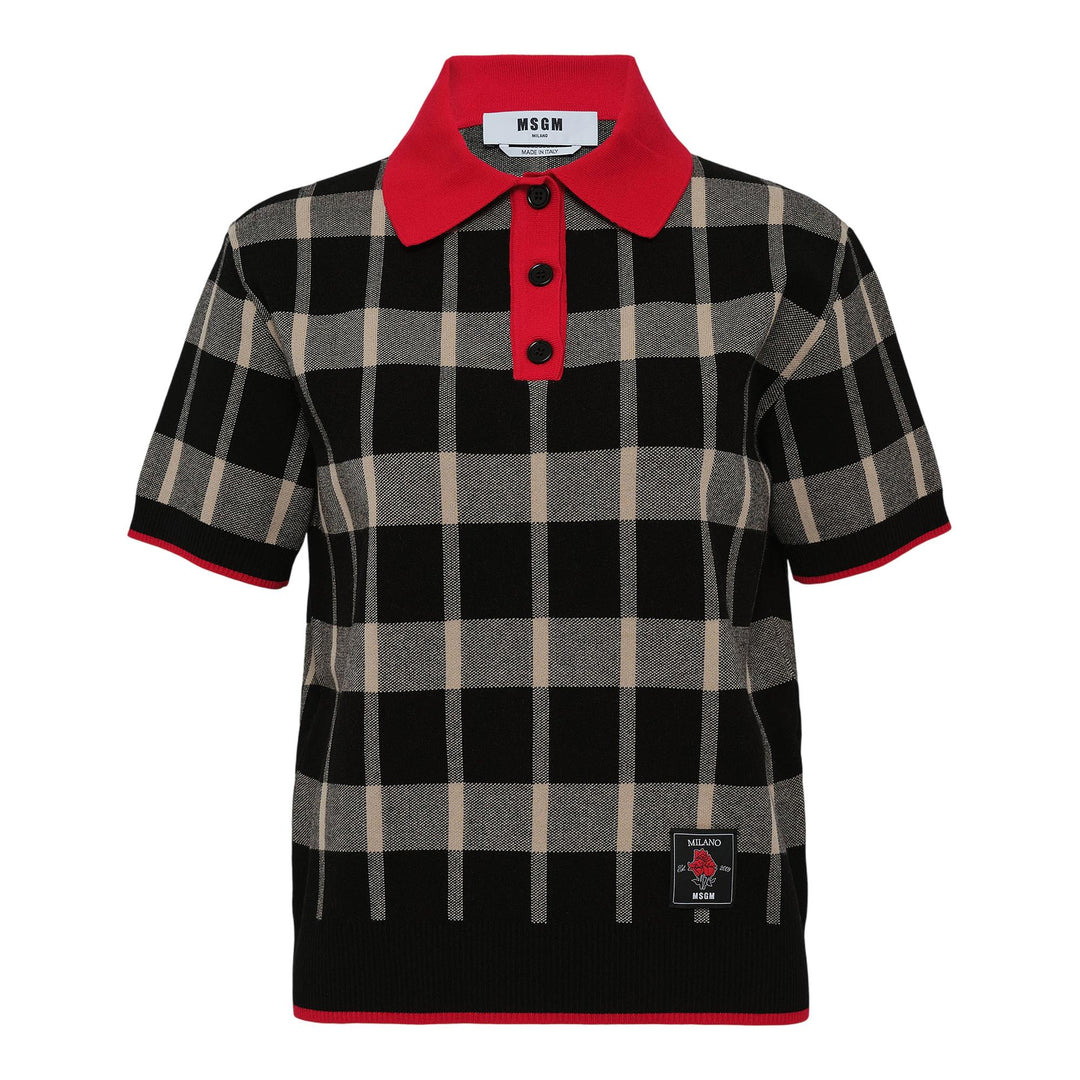 Black short-sleeved polo shirt in techno piquet with check pattern