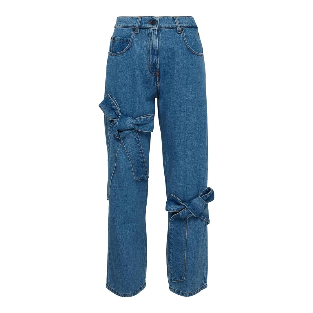 600073382DNM046 / 3941MDP239L/257759/87 - Detachable ribbon bow details at thigh and hem - Classic five-pocket construction - Button fly closure - Medium-weight denim fabric - Straight leg cut - Mid-rise waist - Raw hem finish MSGM Ribbon Detail Denim Jeans deliver contemporary streetwear with playful architectural elements and Italian craftsmanship. Crafted from premium medium-weight denim in classic blue wash, featuring detachable ribbon bow details at the thigh and hem for customizable styling. The straight-leg silhouette and signature MSGM design philosophy create a distinctive statement piece that bridges casual and avant-garde aesthetics.