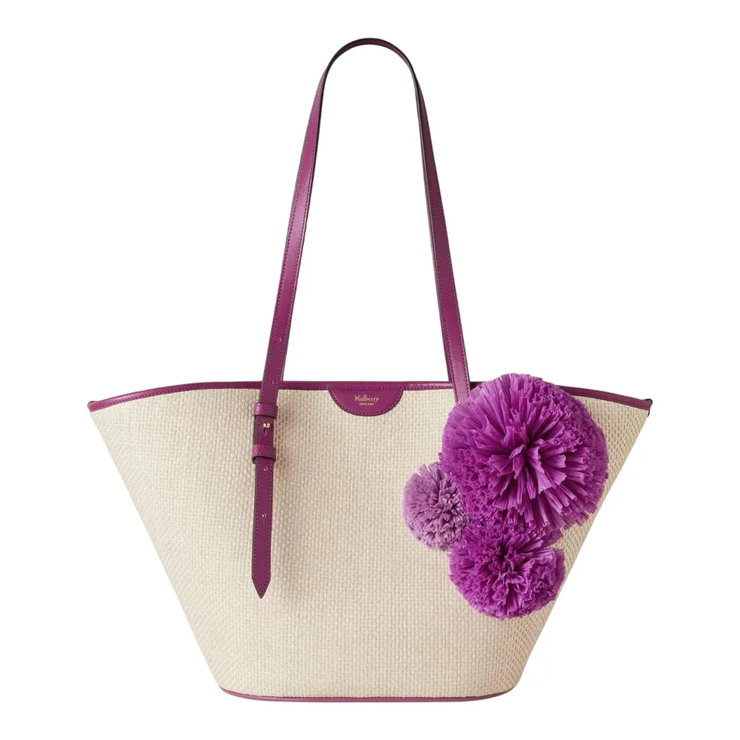 600070974PUR0OS / A25HH9730/000J512 - Natural woven raffia construction - Premium leather handles and trim - Purple orchid bloom pom-pom embellishments - Spacious main compartment - Open-top design - Medium tote size - Unlined interior - Handcrafted construction The Mulberry Basket Tote delivers luxury summer styling with handcrafted raffia construction and vibrant orchid bloom pom-pom details. Made from natural woven raffia with premium leather trim in rich purple, featuring playful dimensional pom-poms for added texture and visual interest. The spacious tote silhouette and signature Mulberry craftsmanship create an elegant warm-weather accessory perfect for resort and leisure occasions.