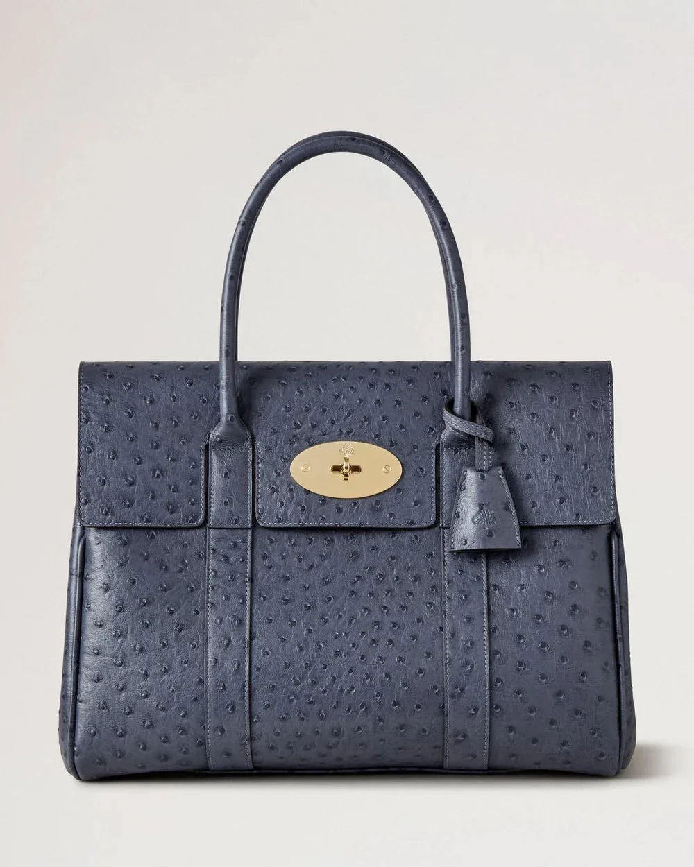 600077090BLU0OS / S26HH9930/738U918 - Signature postman's lock closure with gold-tone hardware - Dual top handles with comfortable grip - Embossed ostrich print leather construction - Spacious main compartment with zip closure - Removable luggage tag detail - Structured rectangular silhouette - Interior organizational pockets The Mulberry Bayswater Ostrich Print delivers timeless British luxury with distinctive textured craftsmanship. Crafted from premium leather with an embossed ostrich print finish in sophisticated navy, featuring the iconic postman's lock closure and structured silhouette. The spacious interior and dual top handles create a versatile statement piece that embodies Mulberry's heritage design philosophy.