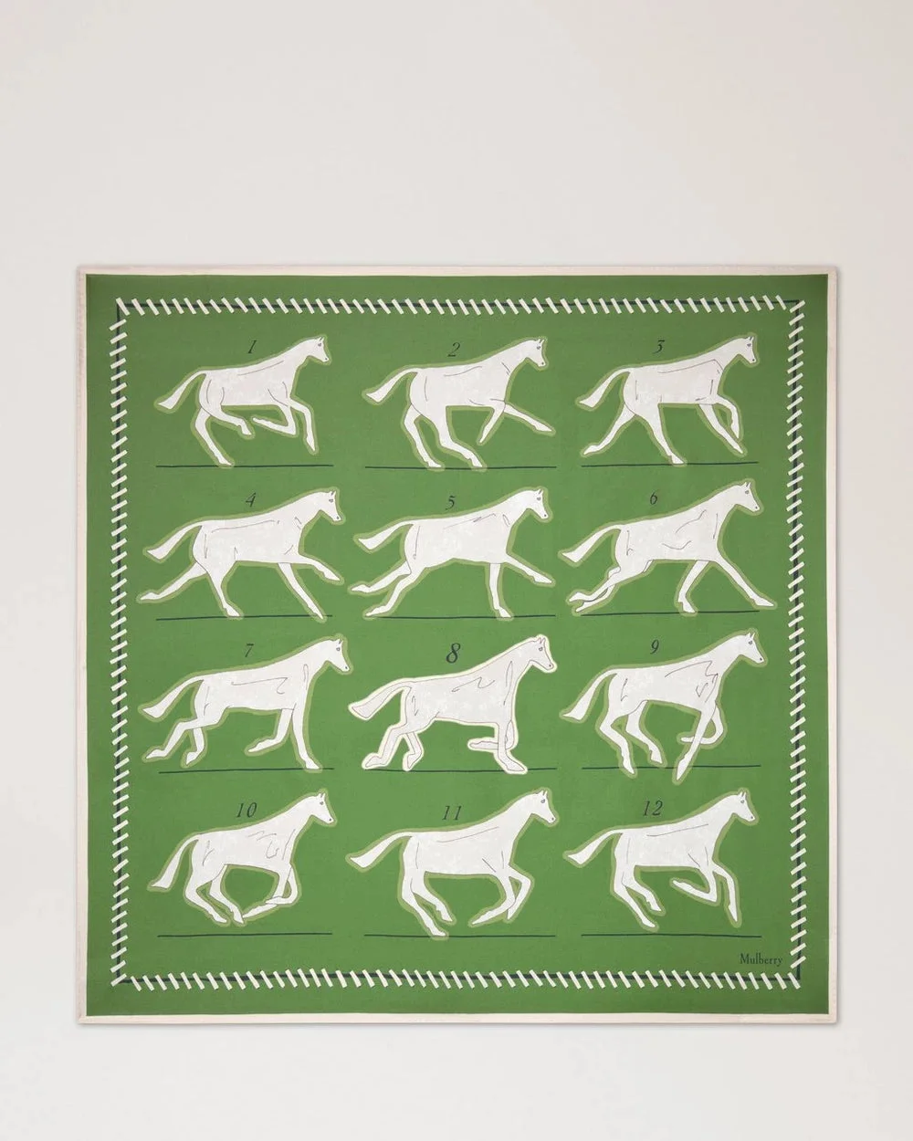 300051539GRN-NS / S6VS4876/169Q740 - Classic square scarf format - Sequential horse motion study print - Decorative chain-link border detail - Numbered equestrian poses 1-12 - Forest green and white colorway - Premium silk construction - Versatile styling options The Mulberry Chalk Horse Square delivers equestrian elegance with British luxury heritage and sophisticated equine motifs. Crafted in rich forest green silk with contrasting white horse silhouettes, featuring twelve distinct galloping poses in sequential motion study. The classic square format and decorative chain-link border create a timeless accessory for modern styling.