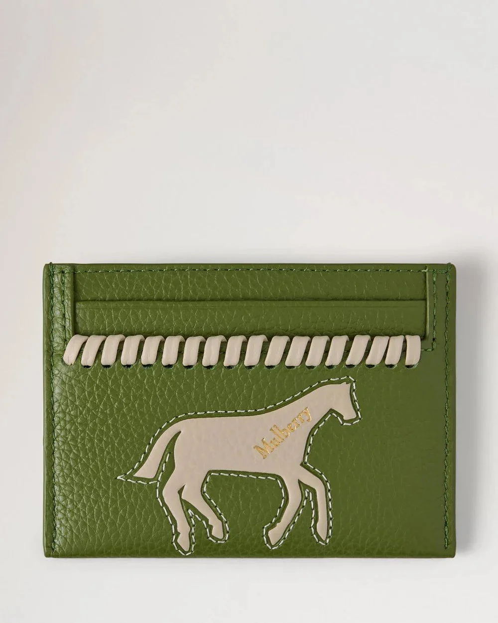 600079547GRN0OS / S26RL8990/000Q760 - Premium textured leather construction - Embossed horse motif design - Multiple credit card slots - Contrast topstitching detail - Compact slip design - Gold-tone Mulberry branding The Mulberry Horse Credit Card Slip delivers luxury organization with equestrian-inspired design and premium craftsmanship. Crafted from textured leather in sophisticated olive green, featuring an embossed horse motif and contrast stitching throughout. The compact silhouette and multiple card slots create an elegant accessory for everyday sophistication.