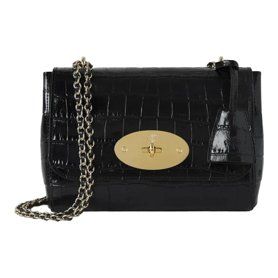 300048568BLK-NS / A5HH9590/641A100 - Signature postman's lock closure - Adjustable chain shoulder strap - Crocodile-embossed leather construction - Gold-tone hardware - Flap-over design - Compact structured silhouette The Mulberry Lily Small Croc delivers iconic British luxury with sophisticated crocodile-embossed leather craftsmanship. Crafted from high-gloss black croc-effect leather, featuring the signature postman's lock closure and gold-tone hardware throughout. The compact silhouette and chain strap create versatile day-to-evening elegance for the modern woman.