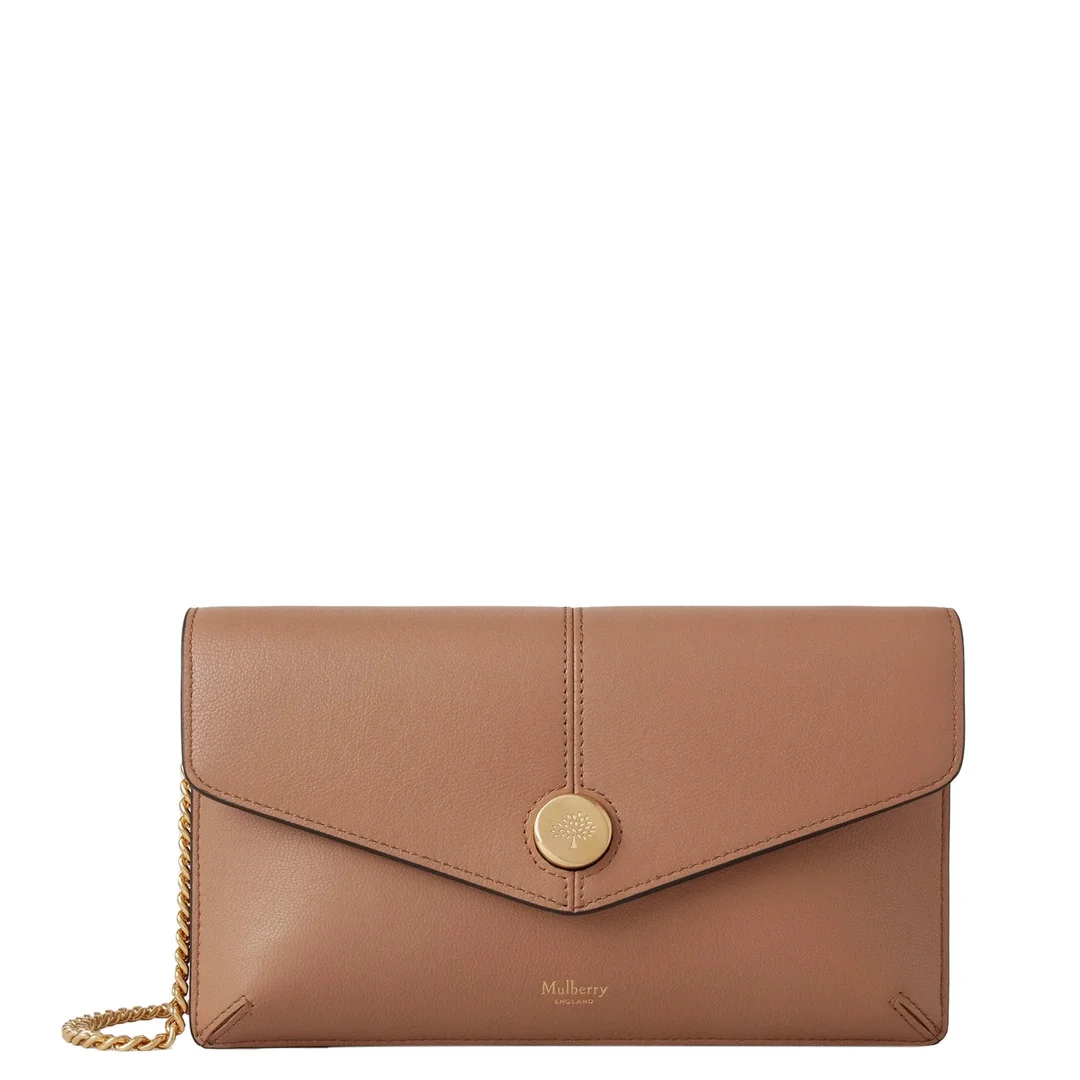 600061072BRN0OS / BS25RL8708/587E126 - Envelope flap closure with press stud fastening - Detachable gold-tone chain strap - Micro classic grain leather construction - Interior slip pocket - Signature Mulberry tree logo hardware - Convertible clutch to crossbody design The Mulberry Press Stud Pochette Chain delivers sophisticated versatility with convertible styling options. Crafted from premium micro classic grain leather in warm camel brown, featuring polished gold-tone hardware and signature tree logo detail. The envelope silhouette with detachable chain strap transitions seamlessly from clutch to crossbody for day-to-night elegance.