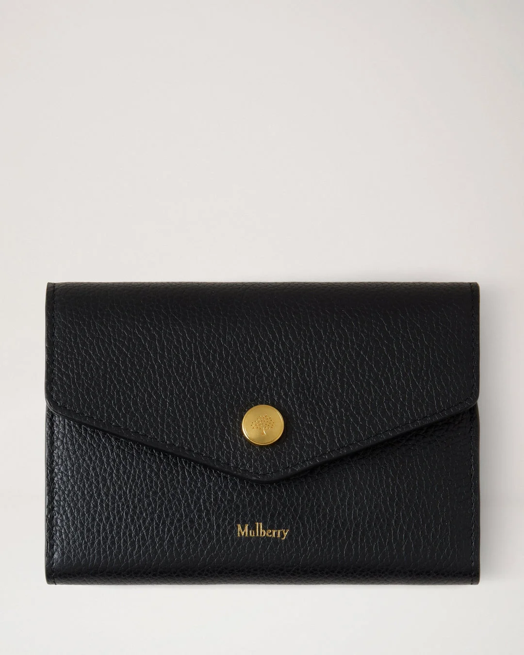 Mulberry Press Stud Wallet delivers refined elegance with secure envelope-style closure and compact functionality. Crafted from premium small classic grain leather in sophisticated black, featuring the signature Mulberry tree logo and gold-tone hardware detailing. The structured silhouette and British heritage craftsmanship create a timeless accessory for everyday luxury.