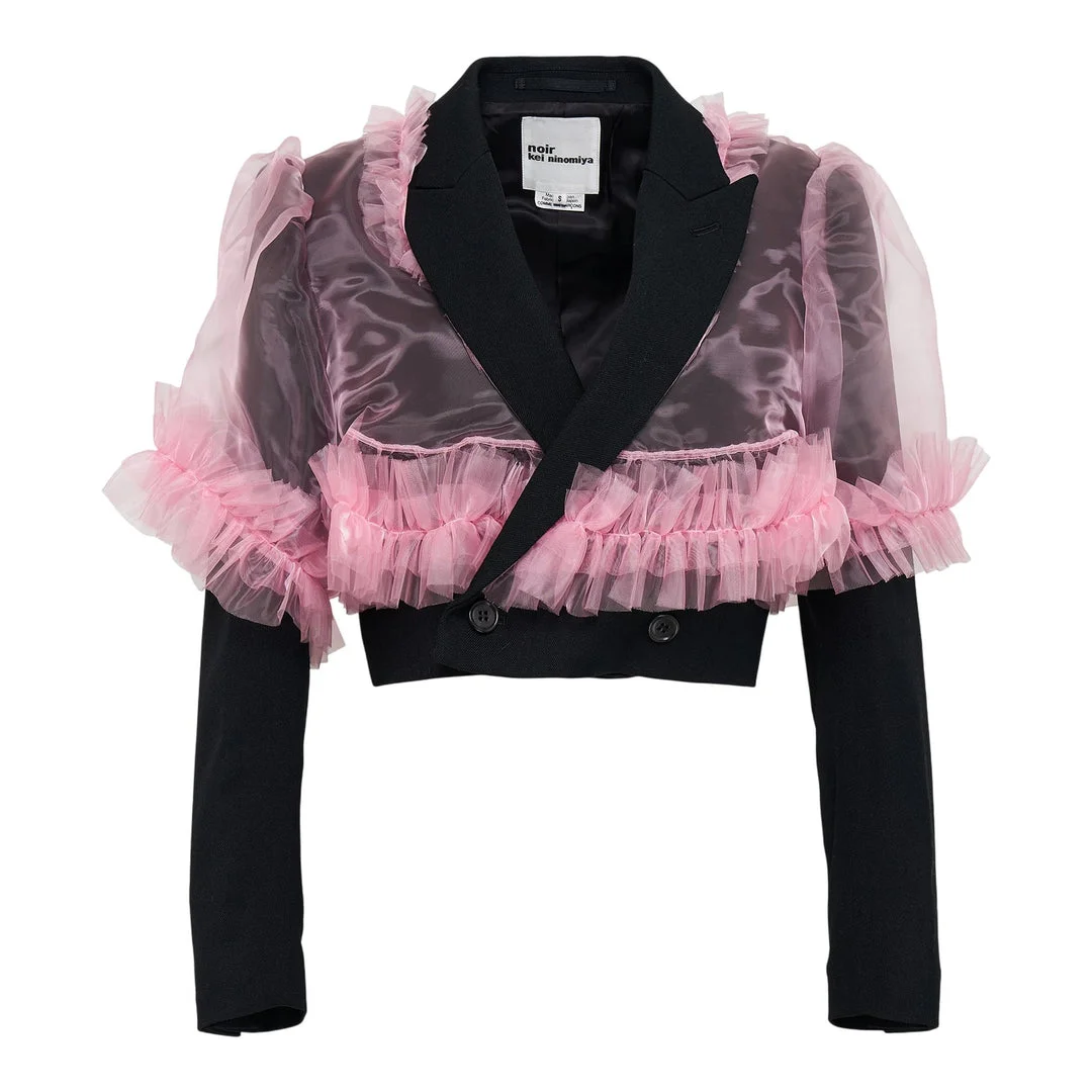 600074397PNK00S / 3P-J003/051/2/1A - Double-breasted button closure - Dramatic pink tulle ruffles throughout - Cropped structured silhouette - Contrasting black wool gabardine base - Notched lapel collar - Long sleeves with fitted cuffs - Avant-garde architectural construction Noir Kei Ninomiya Wool Gabardine Polyester Jacket delivers avant-garde construction with dramatic tulle embellishments and sculptural silhouettes. Crafted from premium wool gabardine with contrasting polyester elements, featuring voluminous pink tulle ruffles and structured black tailoring. The deconstructed design showcases Noir Kei Ninomiya's signature experimental approach to feminine avant-garde fashion.