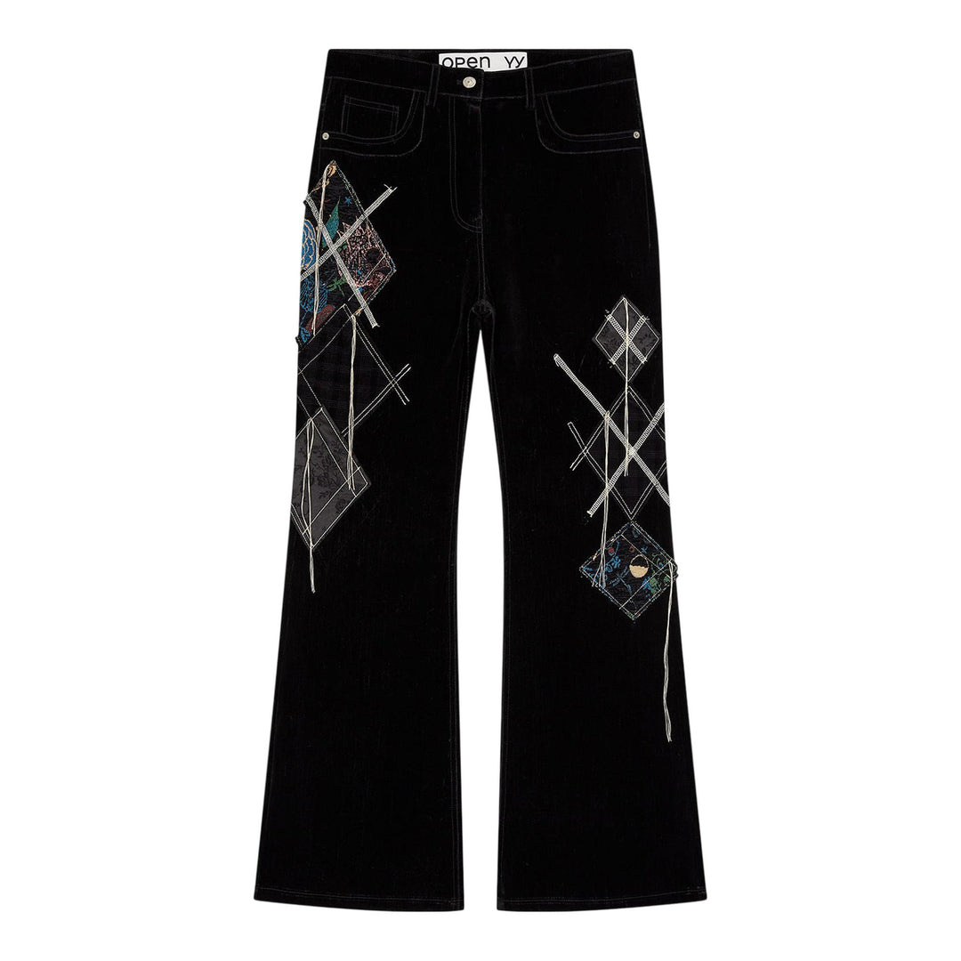 600074785BLK00S / YY254PT004/00/BLK - Black denim construction - Argyle fabric patches with embroidered details - Metallic thread geometric embroidery - Five-pocket styling - Button fly closure - Bootcut flared leg opening - Mid-rise waist - Contrast stitching throughout OPEN YY Argyle Patched Bootcut Pants deliver contemporary streetwear with artistic patchwork construction and flared silhouette. Crafted from black denim featuring geometric argyle patches and intricate metallic thread embroidery throughout both legs. The bootcut design and signature deconstructed aesthetic create a statement piece that bridges high fashion and street culture.