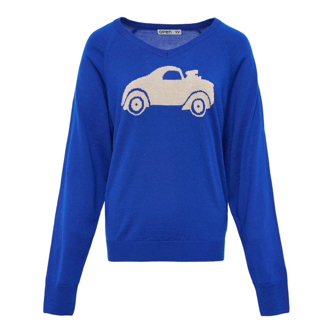 600070743BLU00M / YY253KT003C/00/BLU - V-neck design - Long sleeves with ribbed cuffs - Vintage car graphic in cream - Soft knit fabric construction - Relaxed fit - Ribbed hem and neckline OPEN YY Car Graphic Knit Top delivers contemporary streetwear with playful automotive-inspired design. Crafted from soft knit fabric in vibrant royal blue, featuring a vintage car graphic in contrasting cream across the chest. The relaxed V-neck silhouette and comfortable knit construction create an effortless statement piece for modern casual wardrobes.