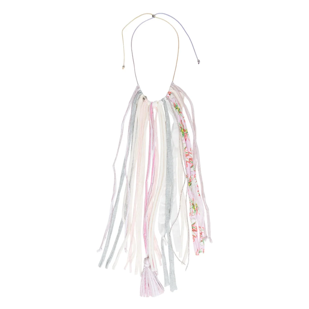 600076872PNK0OS / YY261AC006/00/PNK - Mixed fabric strip construction - Adjustable cord necklace - Flowing fringe design - Tassel accent details - Lightweight textile materials - Versatile length adjustment The OPEN YY Fabric Fringe Necklace delivers contemporary statement jewelry with soft textile construction and artistic movement. Crafted from mixed fabric strips in pastel pink, lavender, and white tones with delicate floral patterns, featuring flowing fringe elements that create dynamic texture. The adjustable cord design and lightweight construction offer versatile styling for layered or standalone wear.
