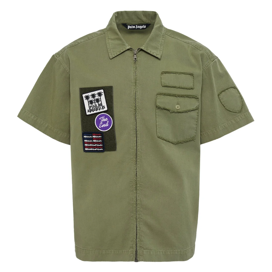 600075183GRN046 / PMGG00BF25FAB001/00/5884 - Full front zip closure - Classic point collar - Short sleeves - Multiple chest pockets with button closure - Detachable velcro patches including Palm Angels logo - Circular patch detail on sleeve - Frayed edge detailing - Relaxed fit Palm Angels Military Patch Zipped Shirt delivers tactical-inspired streetwear with contemporary urban styling and authentic military details. Crafted from premium cotton twill in army green, featuring multiple utility pockets and signature brand patches. The structured fit and front zip closure create a bold statement piece that bridges streetwear and military aesthetics.