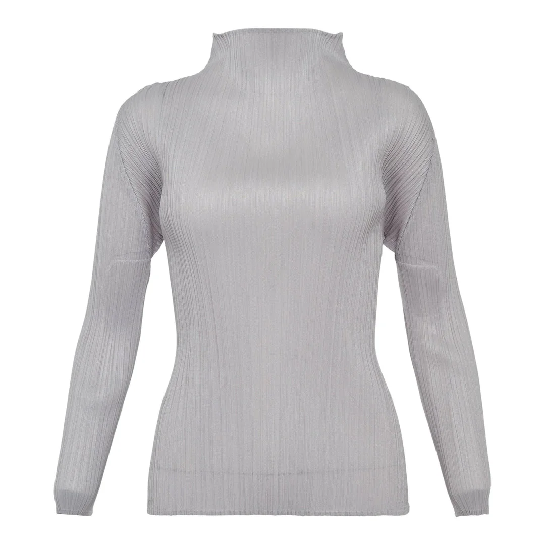 600062172LGY005 / PP57JK104/00/10 - High turtleneck collar - Long sleeves with fitted cuffs - Signature micro-pleated fabric construction - Wrinkle-resistant and packable - Slim fit silhouette - Machine washable PLEATS PLEASE ISSEY MIYAKE Basic Shirt delivers innovative pleated construction with contemporary minimalist design. Crafted from the brand's signature technical pleated fabric in sophisticated light gray, offering exceptional comfort and wrinkle-resistant properties. The signature micro-pleated texture and turtleneck silhouette create a timeless foundation piece for modern wardrobes.
