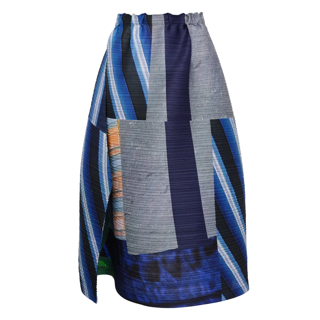 600081607GRY003 / PP66JG675/00/09/JAN - Signature permanent heat-set pleats - Elasticated waistband - Abstract geometric print design - Midi length silhouette - Machine washable pleated polyester - Relaxed A-line fit - Wrinkle-resistant construction PLEATS PLEASE ISSEY MIYAKE City Collage Skirt delivers architectural design with innovative pleating technology and contemporary urban-inspired prints. Crafted from the brand's signature permanent-pleated polyester in a striking blue and grey geometric collage pattern with vibrant accent details. The heat-set pleating process ensures the garment maintains its sculptural form while offering exceptional comfort and movement.