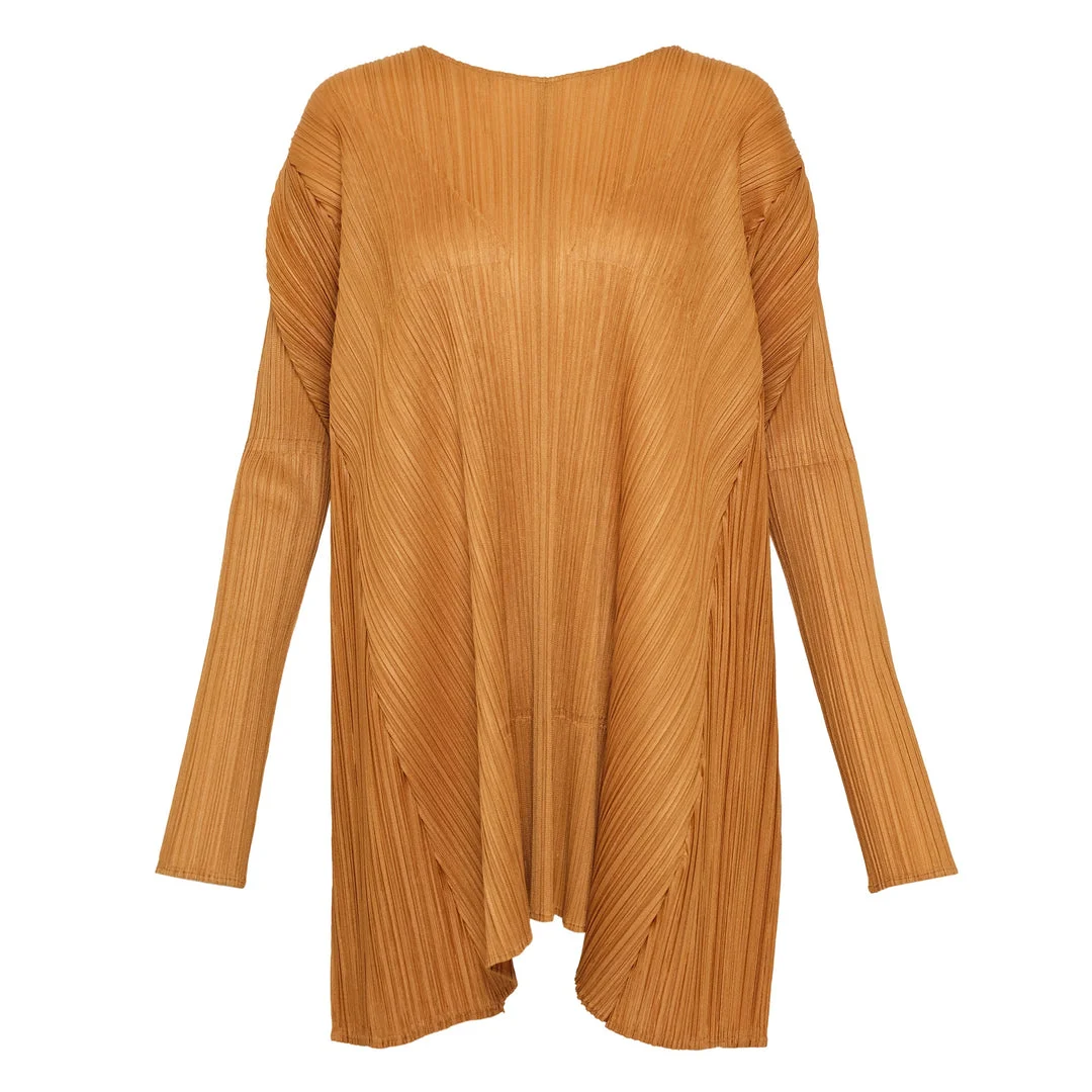 600072577CAM003 / PP58JK471/00/34/DEC - Signature micro-pleated construction - Asymmetrical hemline design - Long sleeves with ribbed cuffs - Crew neckline - Oversized relaxed fit - Machine washable pleated polyester - Packable and wrinkle-resistant PLEATS PLEASE ISSEY MIYAKE Efficient Square 2 Shirt delivers innovative Japanese design with signature pleated construction and architectural silhouette. Crafted from the brand's signature pleated polyester in warm amber tone, featuring the iconic micro-pleating technology that provides comfort and movement. The asymmetrical hemline and oversized fit create a contemporary sculptural form that embodies Miyake's innovative approach to fashion.