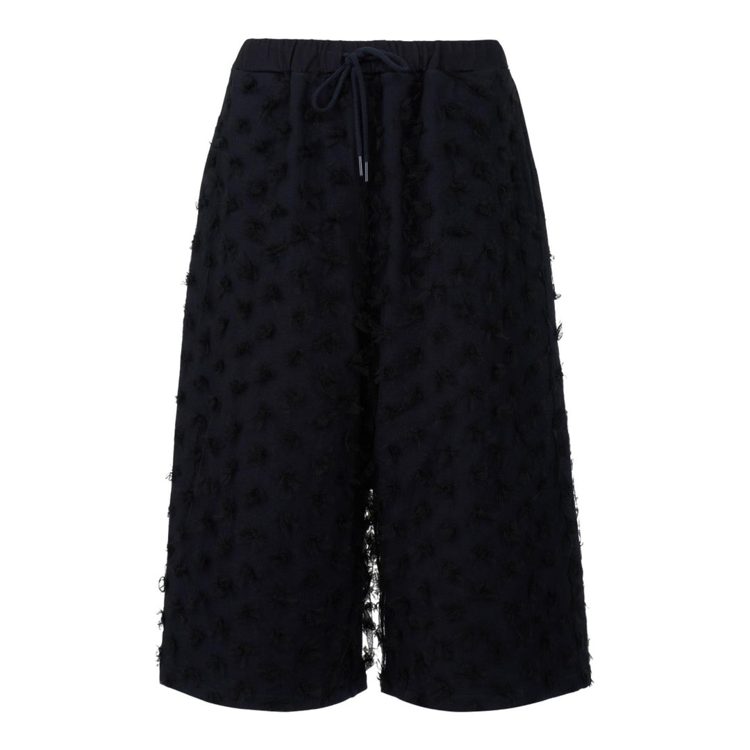 300048717BLK-XS / P5PB2530307W/00/BK - Elasticated waistband with drawstring closure - Textured floral mesh overlay construction - Layered dimensional applique details - Bermuda-length cut - Relaxed fit silhouette - Front slit detail pushBUTTON Black Floral Mesh Layered Bermuda Shorts deliver contemporary streetwear with textured layering and architectural design. Crafted from premium mesh overlay featuring dimensional floral applique details in deep black tones throughout the silhouette. The innovative layered construction and signature pushBUTTON aesthetic create a bold statement piece for modern wardrobes.