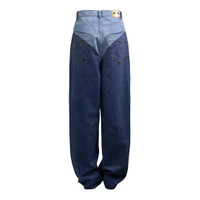 600075775DNM0XS / PB2540011W/00/011W BL - High-waisted design with button closure - Contrast colorblock denim panels - Novelty panty print at waist - Classic five-pocket styling - Exaggerated wide-leg silhouette - Premium denim construction - Relaxed fit pushBUTTON Blue Panty Printed Wide Jeans deliver Korean avant-garde style with bold colorblocking and oversized silhouette. Crafted from premium denim with contrast light and dark blue panels, featuring a playful panty print detail at the waist area. The exaggerated wide-leg cut and high-waisted construction create a statement piece that embodies pushBUTTON's irreverent design philosophy.