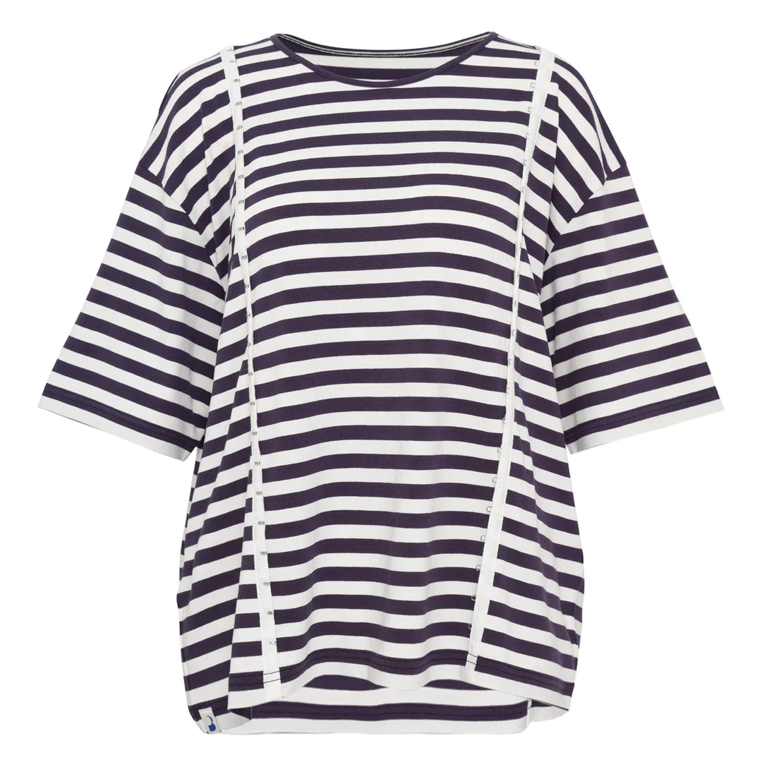 The pushBUTTON Navy Stripe Hook-And-Eye Top delivers contemporary Korean design with playful architectural details. Crafted from soft cotton jersey in classic navy and white stripes, featuring distinctive hook-and-eye closure detailing down the front. The oversized silhouette and signature pushBUTTON deconstructed aesthetic create a modern statement piece.