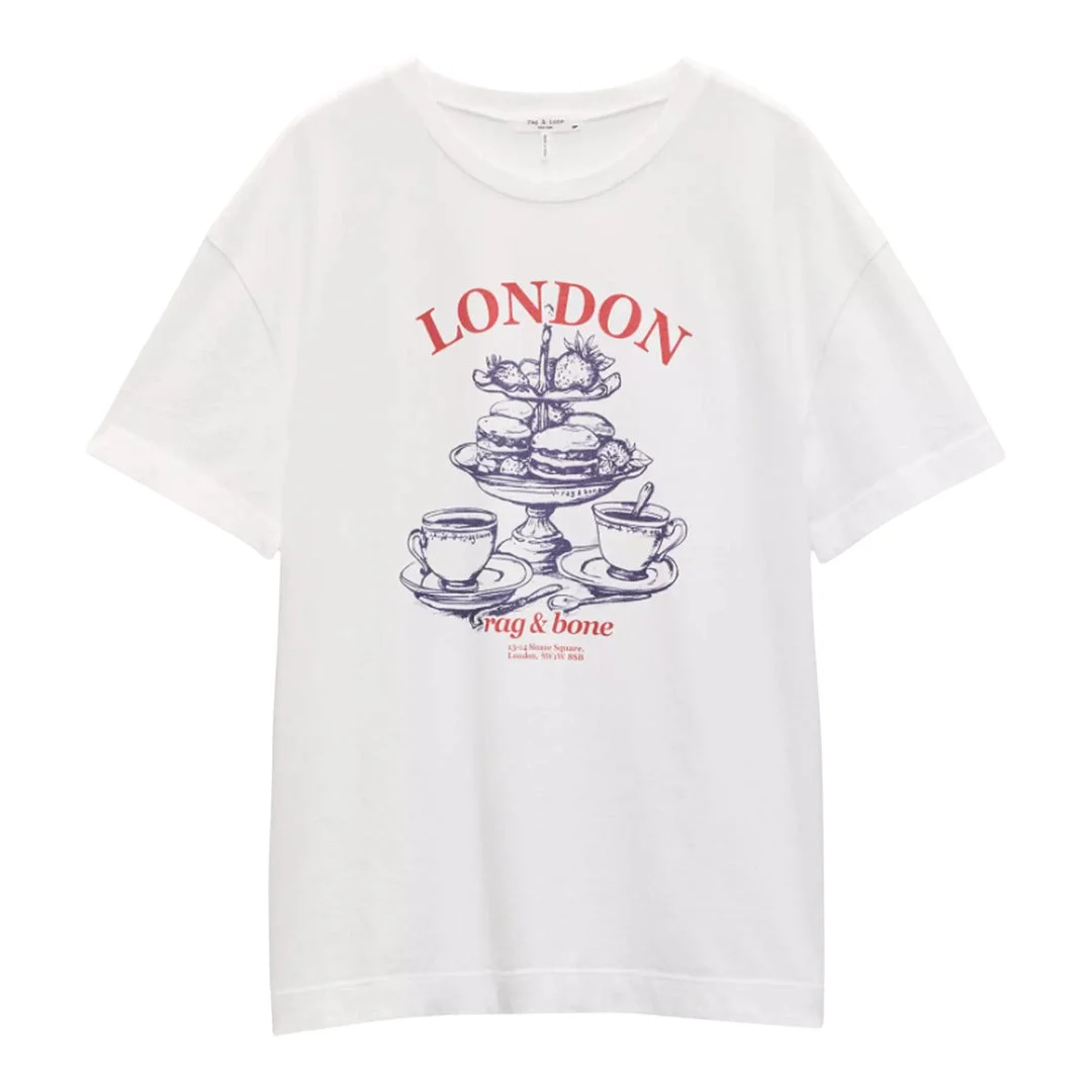 300048045WHT-SS / P5WCC25PT027MI28/00/WHITE - Soft cotton jersey construction - Crew neck design - Short sleeves - London tea service graphic print - Vintage-inspired artwork - Relaxed fit The rag & bone London Graphic Tee delivers contemporary streetwear with British-inspired design and premium comfort. Crafted from soft cotton jersey in classic white, featuring vintage tea service artwork and bold London typography. The relaxed fit and signature rag & bone quality create an effortlessly cool statement piece for everyday wear.