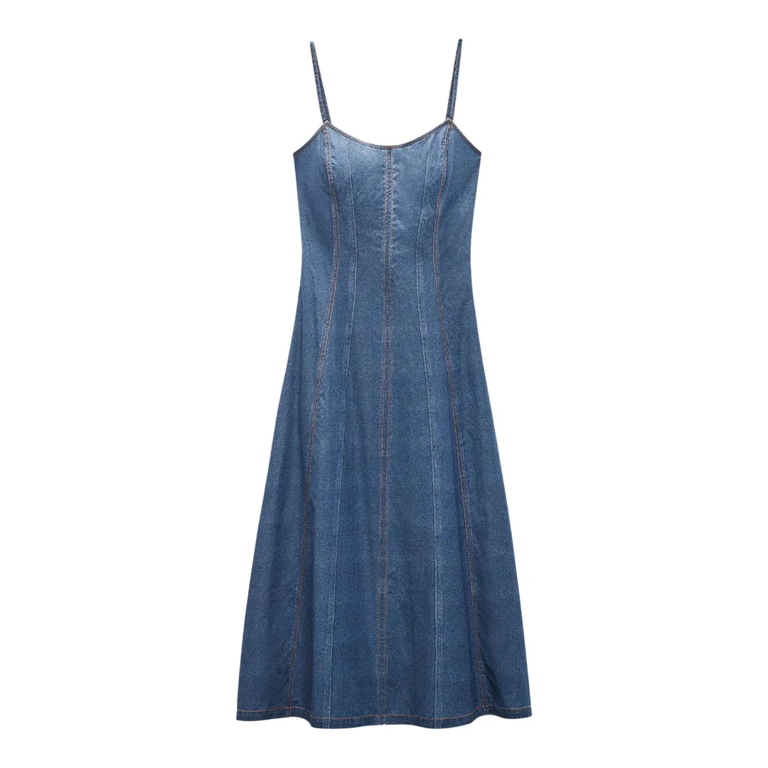 300049100BLU-04 / P5WCW25P30037603/00/SENEC - Adjustable spaghetti straps - Fitted bodice with structured seaming - Midi-length silhouette - Premium denim construction - Visible topstitching details - A-line fit from waist The rag & bone Miramar Poplin Melody Dress delivers effortless contemporary style with structured denim craftsmanship. Constructed from premium denim with visible seam detailing throughout, creating a fitted bodice that flows into a midi-length silhouette. The adjustable spaghetti straps and clean-lined construction showcase the brand's signature modern American aesthetic.