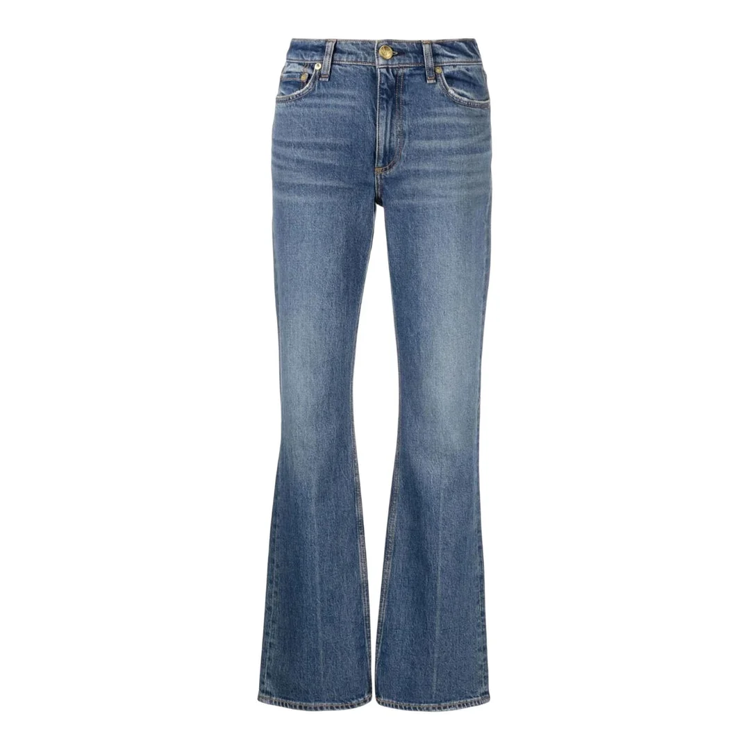 300043221BLU-25 / A4WDD22H2928B7HH/00/HUNTLEY - High-rise waist - Flared leg silhouette - Classic five-pocket styling - Button and zip fly closure - Premium cotton denim construction - Medium blue wash - Regular fit through thigh The rag & bone Peyton Flared Jeans deliver contemporary denim styling with a flattering vintage-inspired silhouette. Crafted from premium cotton denim in classic medium blue wash, featuring a high-rise waist and flared leg opening. The structured fit and quality construction create a timeless wardrobe staple with modern appeal.