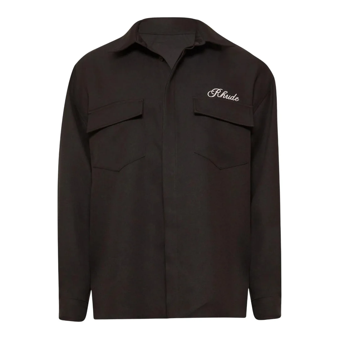 300048944BLK-SS / P5RHPF25SR02731/00/0015 - Dual chest pockets with button flaps - Classic point collar - Long sleeves with button cuffs - Full button-up front closure - Embroidered RHUDE logo on chest - Boxy oversized fit - Cotton blend construction RHUDE Boxy Long Sleeve Work Shirt delivers contemporary streetwear with utilitarian design elements and relaxed silhouette. Crafted from durable cotton blend in deep olive green, featuring dual chest pockets and classic work shirt construction. The oversized boxy fit and signature RHUDE branding create a modern take on classic workwear aesthetics.