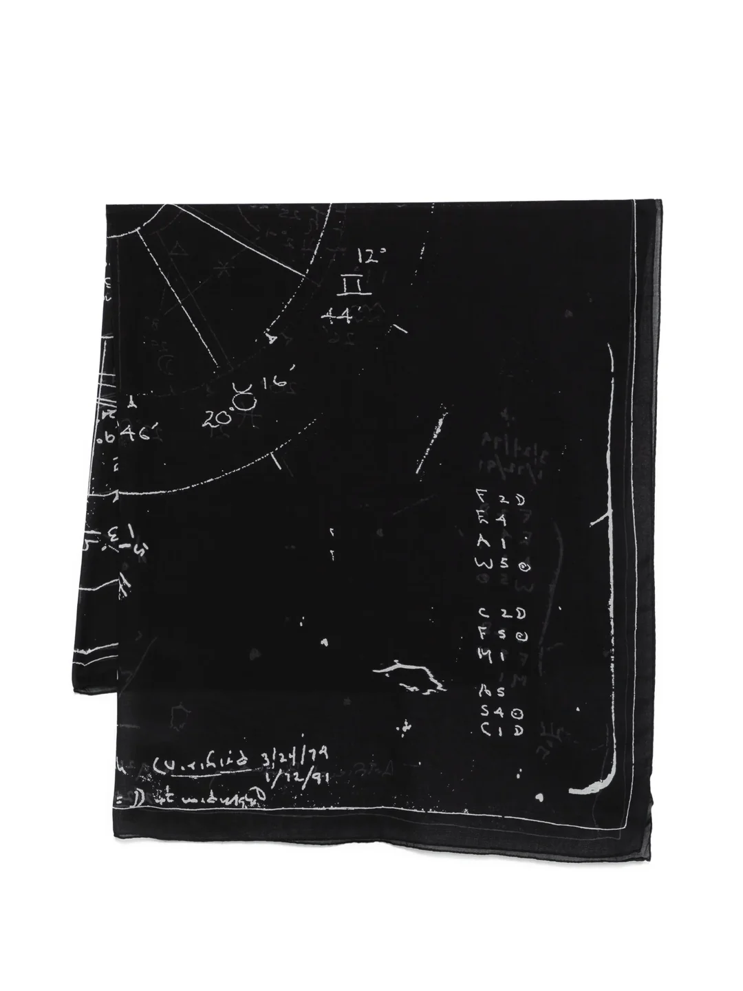 600081838BLK0OS / RR01F2467/SCACP1/0911 - 140x140cm square format - 100% cotton construction - Celestial and astrological motifs - Contrasting white graphics on black base - Multi-functional design - Rick Owens signature aesthetic Rick Owens Astrology Flag Scarf 140x140 delivers avant-garde mysticism with architectural design sensibilities and celestial symbolism. Crafted from premium cotton in deep black with contrasting white celestial markings and astrological motifs throughout. The large-scale format and signature DRKSHDW aesthetic create a statement piece that bridges fashion and cosmic spirituality.