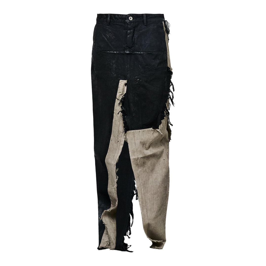 600071246BLK025 / RO02E4393/BMC921/0921 - 13oz heavyweight denim construction - Distressed panels with raw edges - Asymmetrical deconstructed design - Front button closure - Belt loops at waistband - Frayed detailing throughout - Relaxed fit Rick Owens Denim Sliced Skirt delivers avant-garde deconstruction with dramatic architectural silhouette and raw edge detailing. Crafted from 13oz heavyweight denim in deep black with distressed panels and exposed frayed elements throughout. The asymmetrical construction and signature Rick Owens aesthetic create a bold statement piece for contemporary wardrobes.