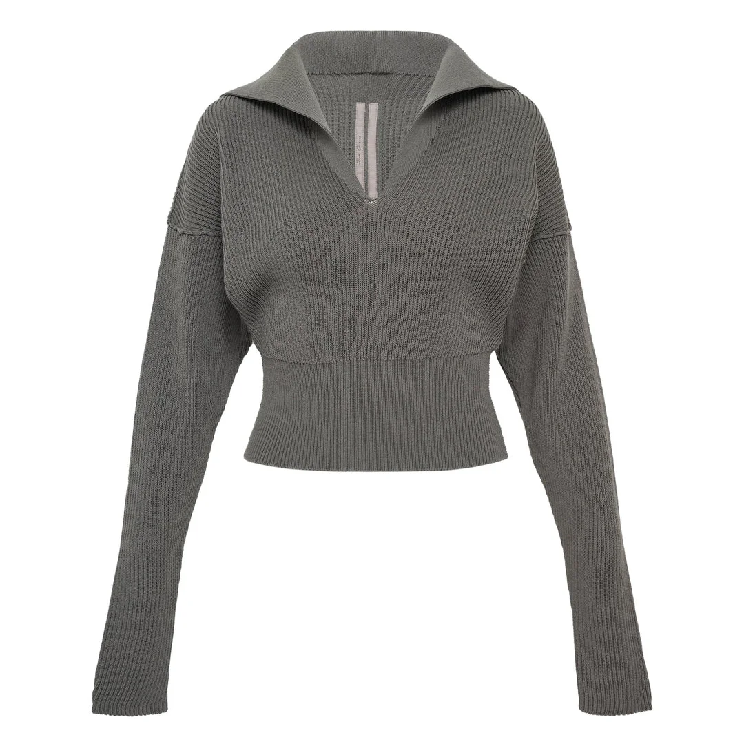 600078875LGY00L / RP01F6634/KWVH/35 - Heavy wool ribbed knit construction - Deep V-neckline with collar detail - Cropped body length - Long sleeves with fitted cuffs - Structured ribbed texture throughout - Form-fitting silhouette Rick Owens Dracu Cropped V Heavy Wool Knit delivers avant-garde luxury with architectural silhouette and premium construction. Crafted from heavy wool ribbed knit in sophisticated olive green, featuring dramatic V-neckline and cropped proportions. The structured collar and fitted body create Rick Owens' signature deconstructed aesthetic for contemporary wardrobes.