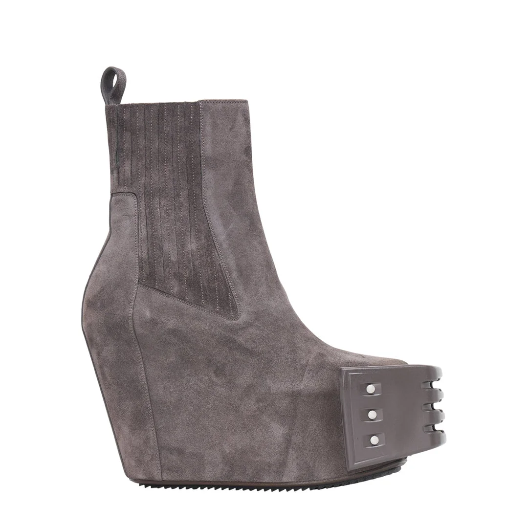 600076335CHA041 / RU01F2848/LVSGR/78 - Premium suede leather construction - Elastic side goring for easy slip-on wear - Dramatic wedge platform heel - Geometric cutout sole design - Pull tab at heel - Architectural silhouette - Platform front sole Rick Owens Grilled Wedge Beatle Boots deliver avant-garde platform construction with dramatic architectural silhouette and innovative sole design. Crafted from premium suede leather in sophisticated grey, featuring signature elastic goring and distinctive wedge heel with geometric cutout details. The elevated platform sole and deconstructed aesthetic create a bold statement piece that embodies Rick Owens' distinctive gothic minimalism.