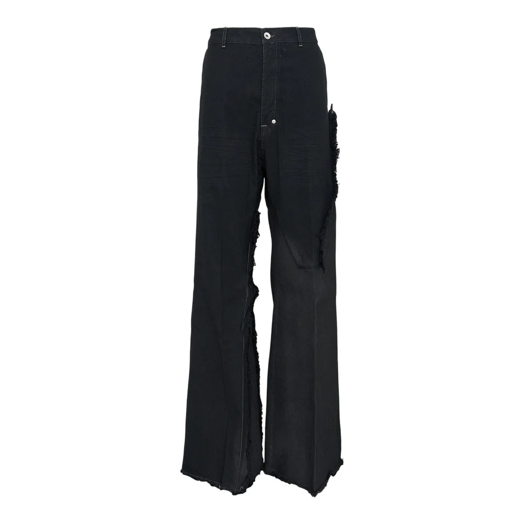 600071434BLK030 / RR02E1308/BBCL/09 - 13oz heavyweight denim construction - Button fly closure - Extensive distressed detailing - Raw frayed edges - Wide leg silhouette - Cotton tela paneling - High waisted fit Rick Owens Joris Trousers deliver avant-garde denim construction with deconstructed aesthetics and rebellious edge. Crafted from 13oz heavyweight denim in deep black wash, featuring dramatic distressed detailing and raw frayed edges throughout. The architectural silhouette and signature Rick Owens proportions create a bold statement piece for contemporary wardrobes.