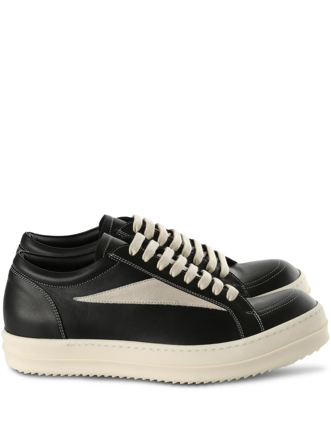 300052018BLK-43 / E6RU01F2897/LCOLVS/991 - Premium black leather construction - Contrast cream leather accents - Lace-up closure with flat cotton laces - Signature platform sole - Architectural toe cap design - Contrast white rubber outsole - Deconstructed silhouette Rick Owens Vintage Sneaks deliver avant-garde luxury footwear with architectural construction and street-ready functionality. Crafted from premium black leather with contrast cream detailing, featuring the brand's signature deconstructed aesthetic and platform sole construction. The distinctive silhouette and industrial hardware create a bold statement piece that bridges high fashion and contemporary streetwear.