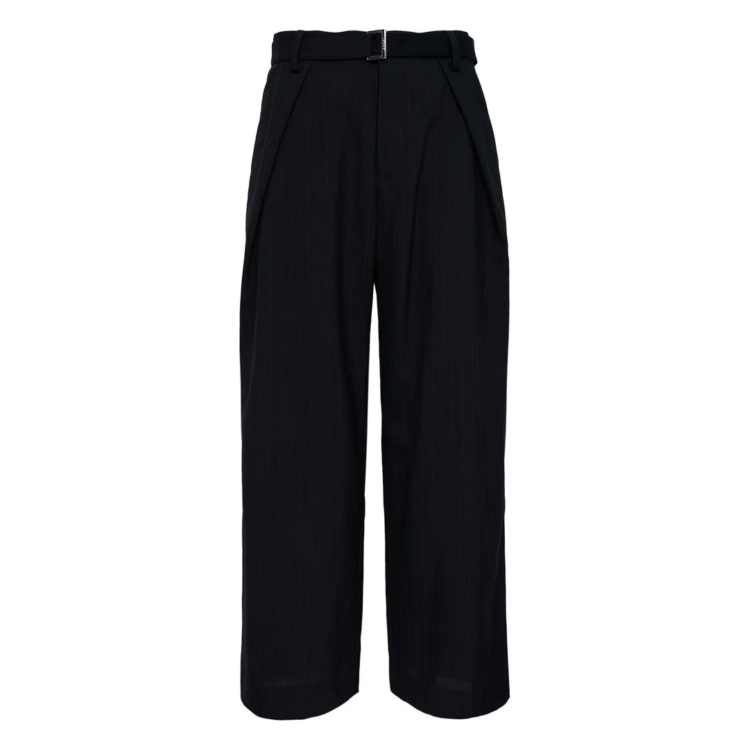600078558BLK001 / 26-03960M/00/001 - High-waisted design with belt - Metal buckle closure - Chalk stripe pattern throughout - Wide-leg silhouette - Premium wool blend construction - Relaxed fit - Side seam detailing sacai Chalk Stripe Pants deliver sophisticated Japanese tailoring with contemporary architectural construction. Crafted from premium wool blend fabric in deep navy with subtle chalk stripe detailing, featuring the brand's signature deconstructed aesthetic. The relaxed wide-leg silhouette and premium hardware create an elevated statement piece for modern wardrobes.