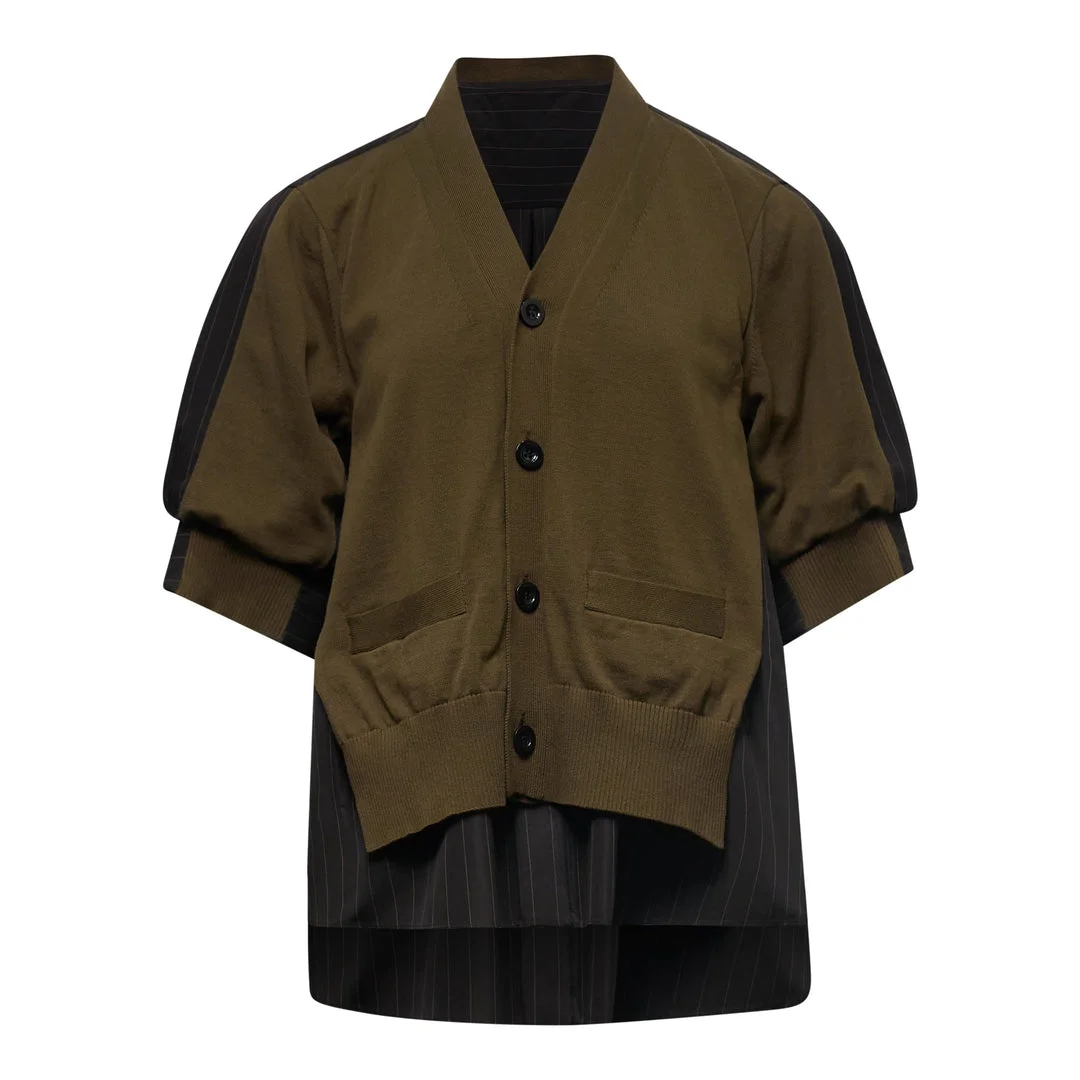 600078440BRN001 / 26-08365/00/601 - Button-front closure with contrast buttons - V-neck design - Two front patch pockets - Ribbed cuffs and hem - Chalk stripe panel overlay - Cotton knit construction - Relaxed fit The sacai Chalk Stripe x Cotton Knit Cardigan delivers hybrid design innovation with the brand's signature layered aesthetic. Crafted from premium cotton knit in olive green with contrasting chalk stripe panel detailing that creates visual depth and textural interest. The deconstructed silhouette features sacai's signature layering technique that redefines traditional cardigan construction.
