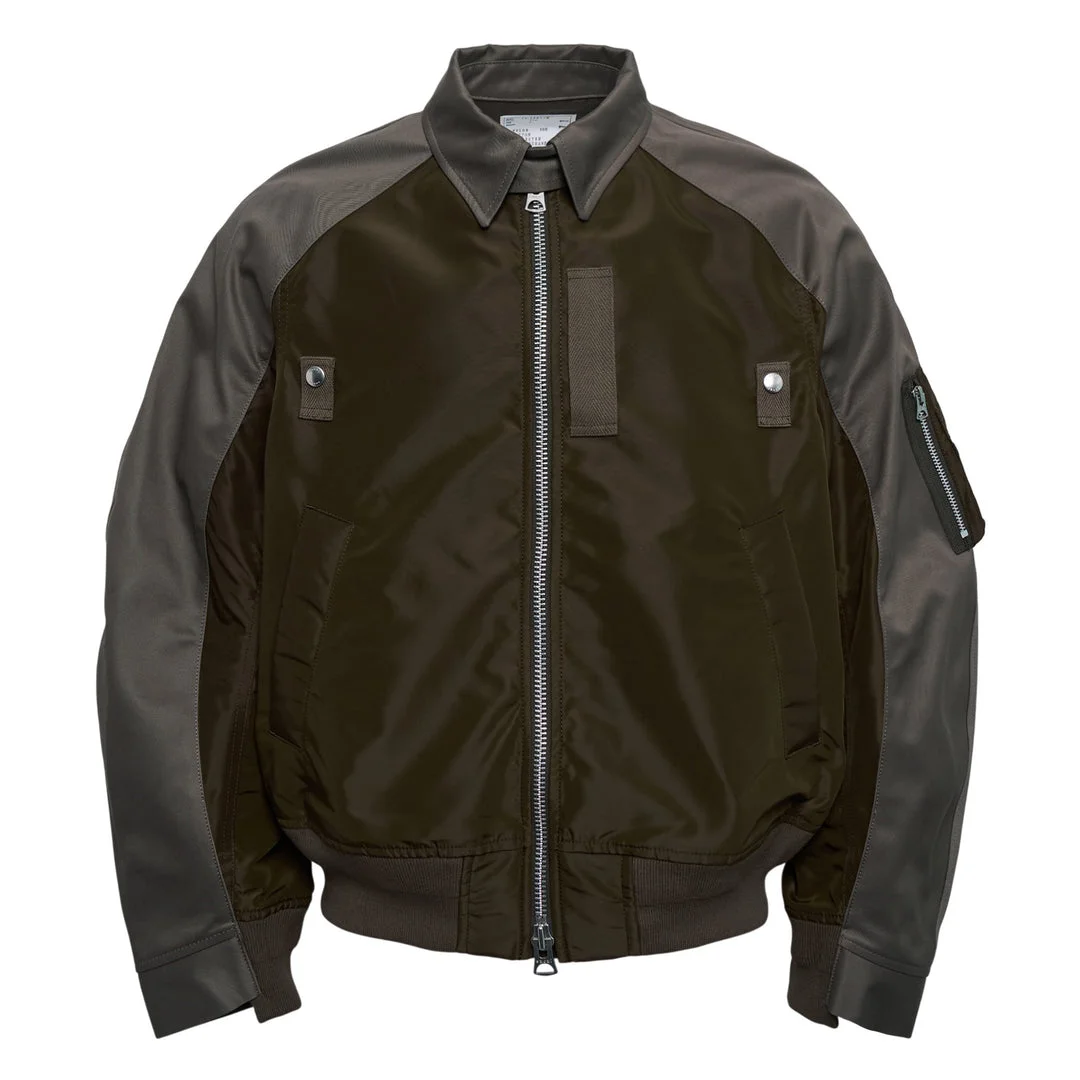 600078539GRY002 / 26-03911M/00/314 - Cotton chino body with nylon twill contrast panels - Full front zip closure - Ribbed collar, cuffs and hem - Front chest pockets with snap closures - Utility pocket on left sleeve - Relaxed bomber fit - Mixed material construction The sacai Cotton Chino x Nylon Twill Blouson delivers hybrid streetwear with signature material contrasts and functional design. Crafted from premium cotton chino body with contrasting nylon twill sleeves and panels, featuring full zip closure and multiple utility pockets. The relaxed bomber silhouette and mixed-material construction showcase sacai's innovative approach to contemporary outerwear.