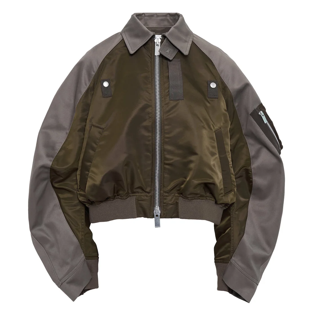 600078358BRN001 / 26-08303/00/606 - Mixed material construction with cotton chino and nylon twill - Contrast paneling in olive and grey - Dual collar design with point collar - Full front zip closure - Utility pocket details with snap closures - Ribbed hem and cuffs - Military-inspired design elements - Regular fit The sacai Cotton Chino x Nylon Twill Blouson delivers avant-garde design through innovative fabric mixing and architectural construction. Crafted with contrast paneling in olive green cotton chino body and grey nylon twill sleeves, featuring dual collar design and military-inspired details. The hybrid construction and signature sacai fabric juxtaposition create a distinctive statement piece that bridges casual and contemporary styling.